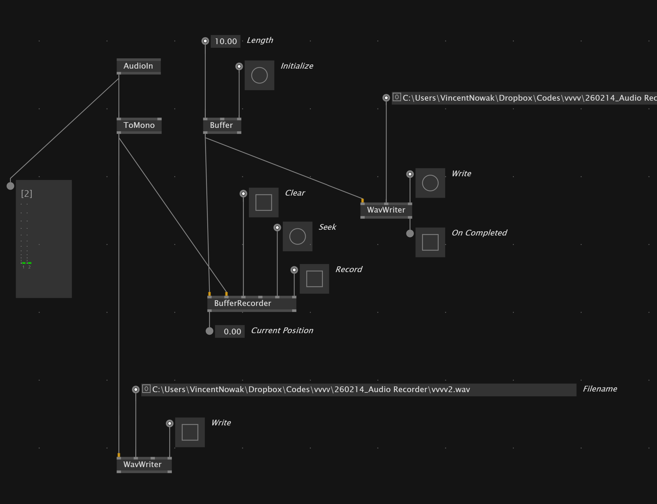 I’d like to record audio in vvvv. Using the Audio Buffer help patch as a reference, I put together the following patch: