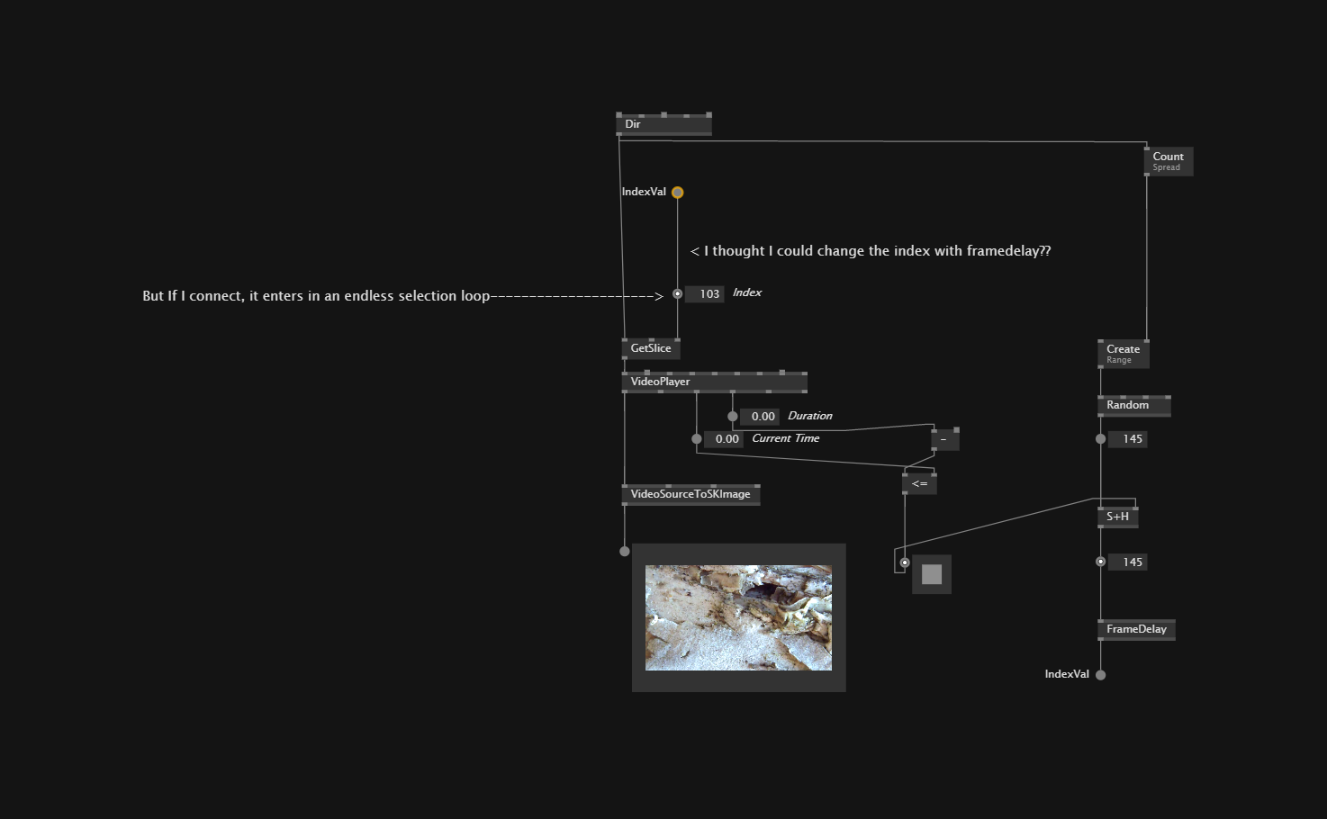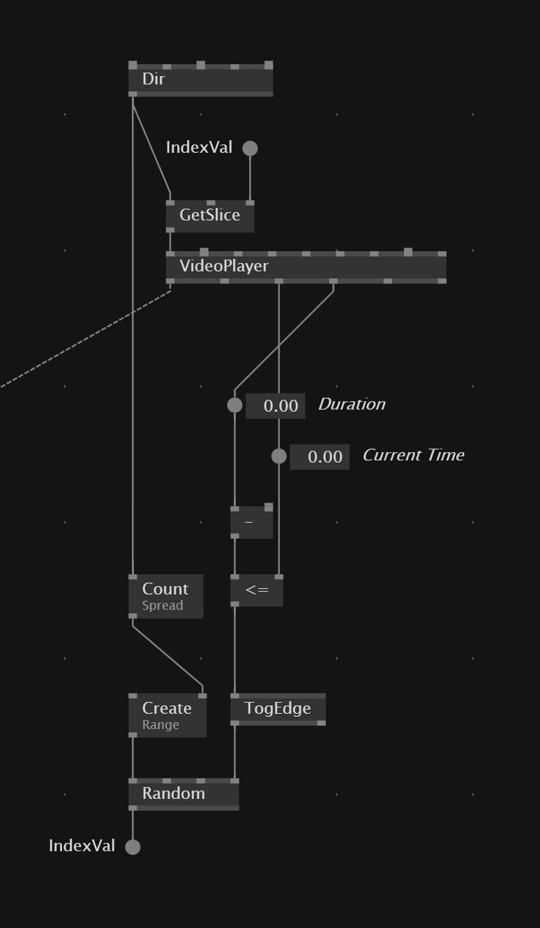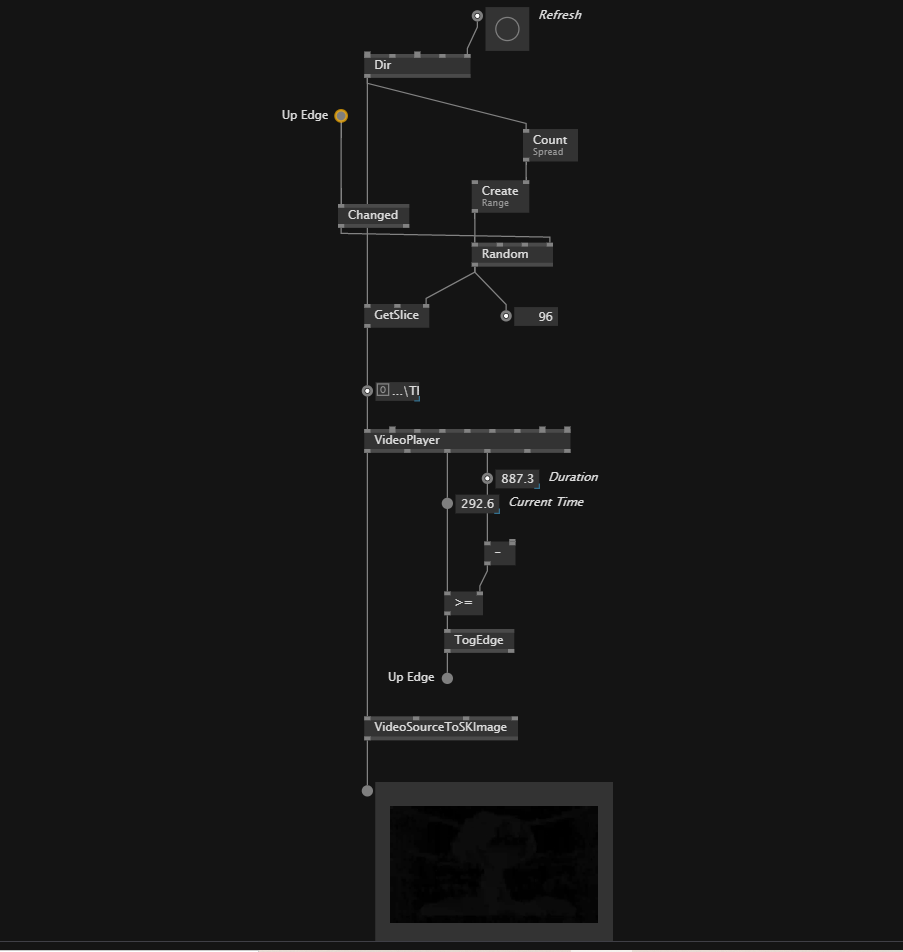 2 : In the second patch you sent, the Changed isn’t necessary since there is already a TogEdge doing the same. TogEdge is act here as a Changed for boolean value. Now for the cache region, this is because some thing such as Create will be called everyframe, while you only need one when Up Edge is True. There is a Cache inside the Random but in general for things that need to happens only when necessary (and not every frame) you put it in a cache region (there are other technic as well) to save performance. In a patch like yours it doesn’t affect much since there isn’t a lot going on but it can be a good thing to keep in mind when working on bigger system, or with big spread of data.