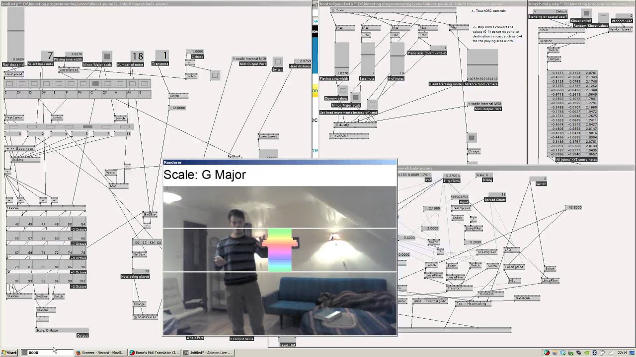 Step-by-step playback of MIDI files. When the user’s hand hits a trigger point, the MIDI file plays one step further. When trying this, using the MIDI Out help file, I got unreliable results, as if the starting points only go by bars, and not smaller note increments. I could perhaps alternatively send some sort of play/stop signal to Ableton Live, but then I imagine I would need to send the BPM information from Live to vvvv.