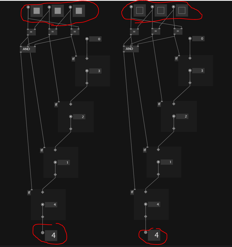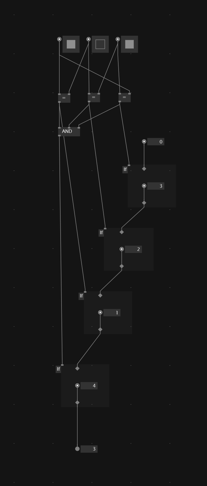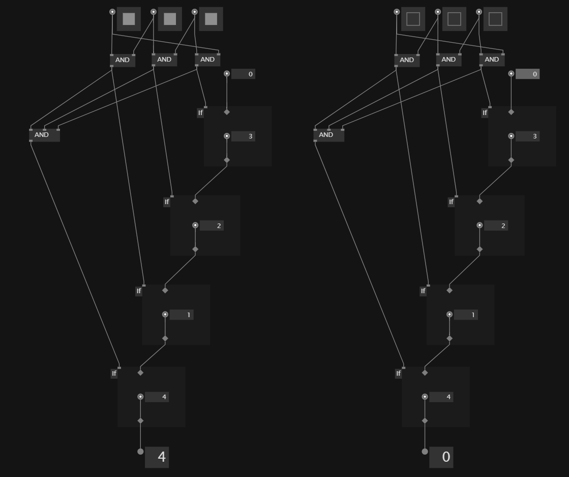 The thing is : the result of the conditions is the same when the 3 bool are all On AND all Off!! Which is not the expected out. And it also means that when bool #1 and bool #2 will output a result either it is both on AND off