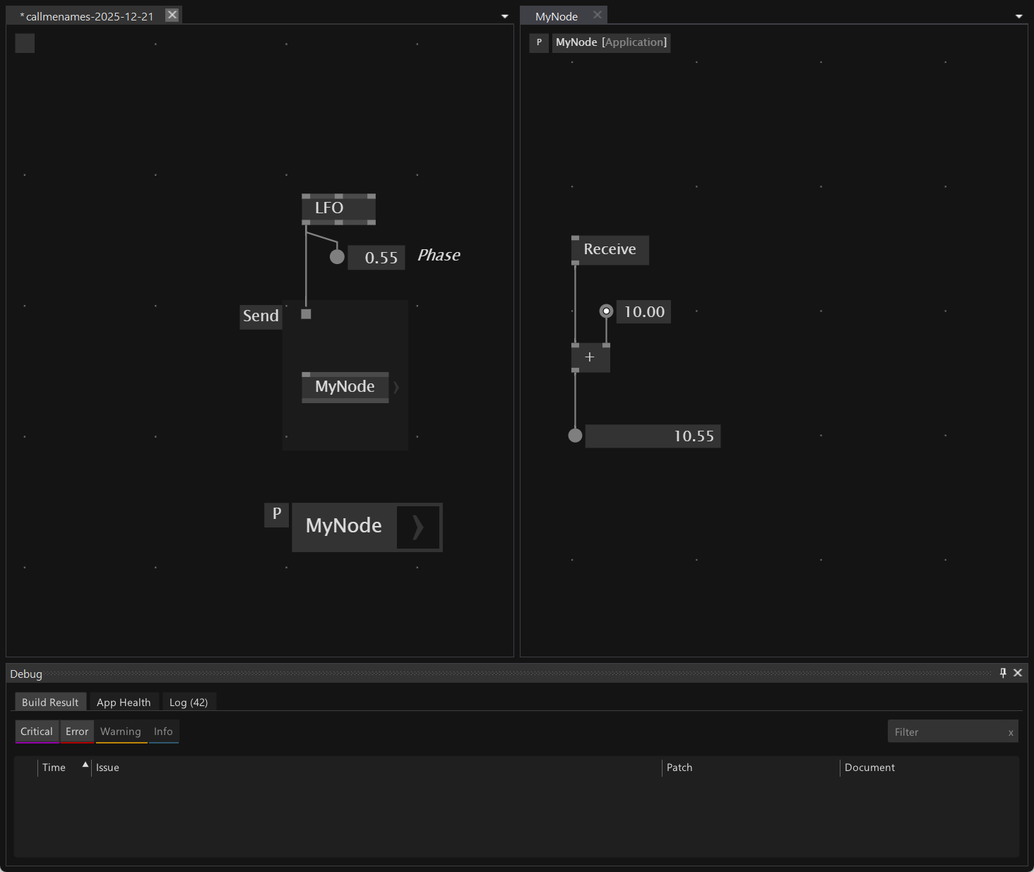 The thing with Send/Receive (Local) is that if I have added a node in the main application patch and surrounded it with Send (Local) region, I can’t use the Receive (Local) inside that node’s definition to receive a value that I’m sending through the Send (Local) region defined in the parent patch. Could a Receive(Scope) node be added, or a flag be added to Receive (Local) to support this?