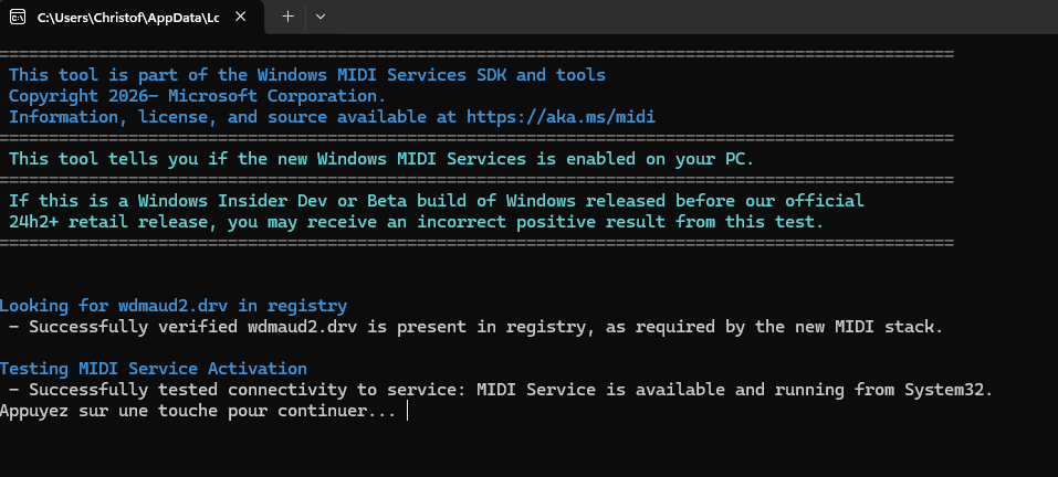 hum after some hours between lechat and Claude, it seems there is a long long time about deployement of new midi driver structure and incompatibility with the Sanford midi portage in gamma. i run this tool : About Windows MIDI Services - Windows MIDI Services and get this result :