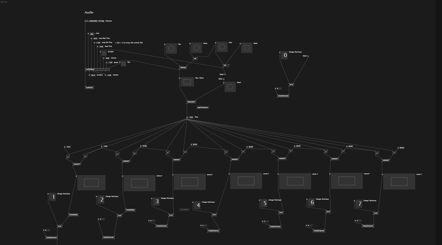 I am building a small sequence player that sends a new index value each time a certain time has passed and updates the index of a switch. I am using the time from a stop watch connected to a file player. I am then using global channels to pass the values on in this sketch. I am using a sample and hold in order to store the index number for each waypoint. This all works fine the first time the patch is running but the second time it breaks. It seems like the sample and hold does not want to work since the value that it holds is the same (The index). I have looked around the forum and it seems like it could have something to do with the frametime? Though a frame delay does not help. Is there a better way of doing this? I have built a reset function that resets the stopwatch, could this be the issue?