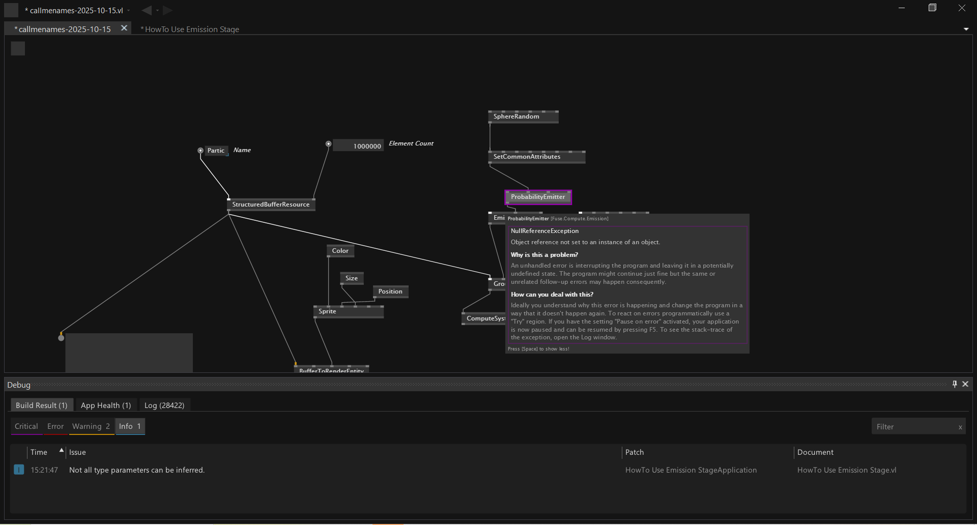 when I copy-paste the whole patch from the Help Browser “how to use Emission Stage” on my own patch, the same happens.