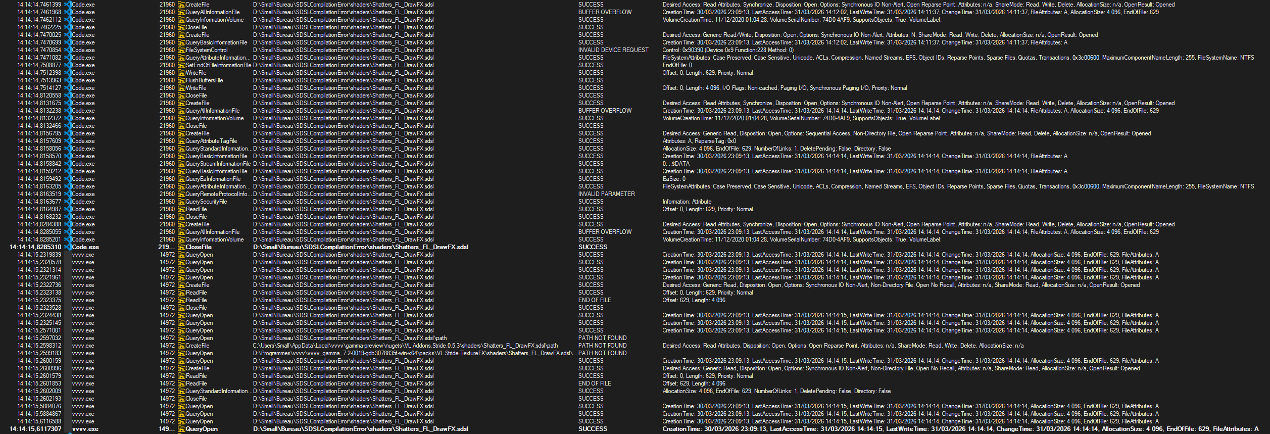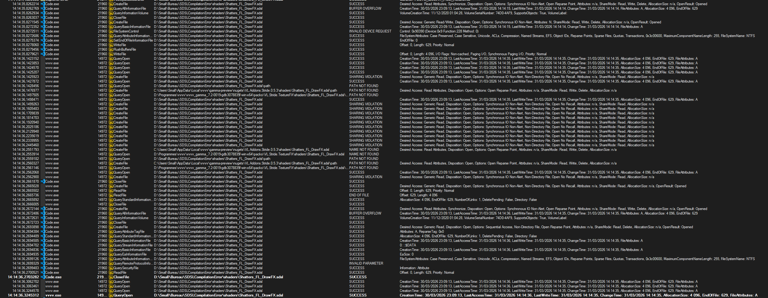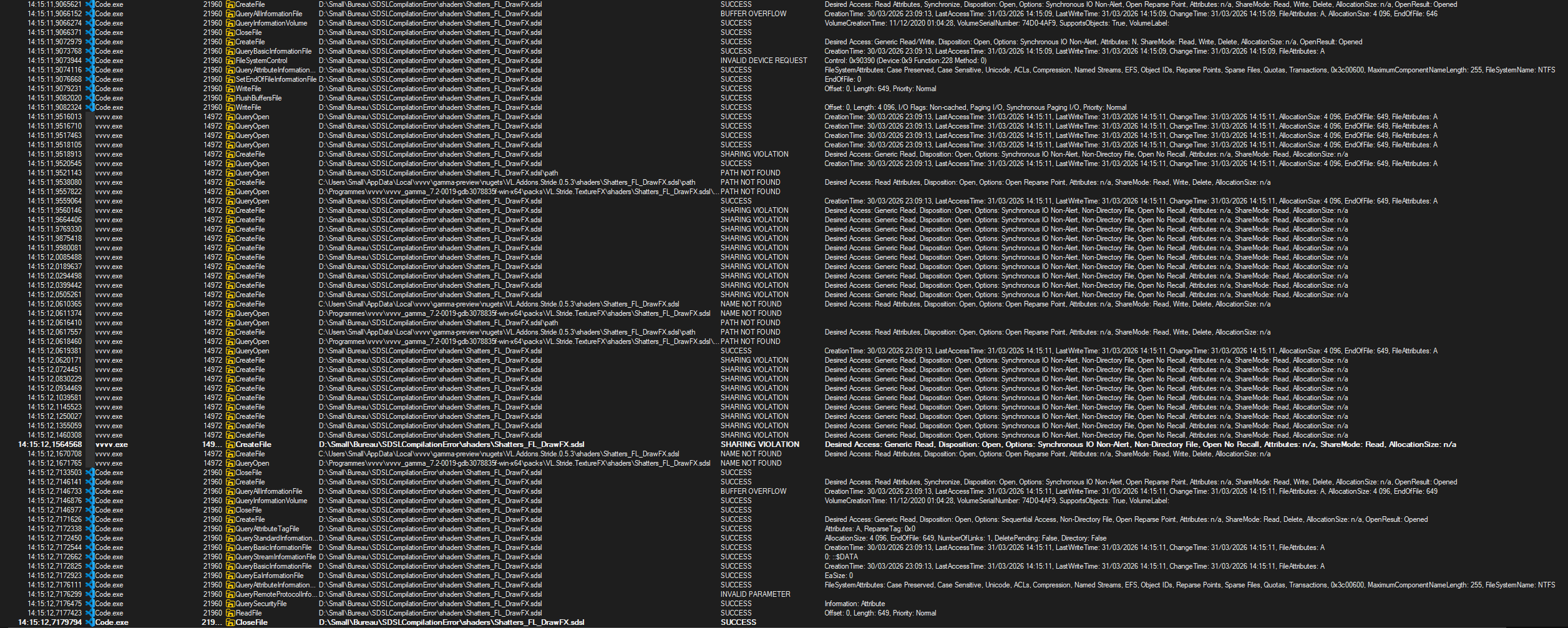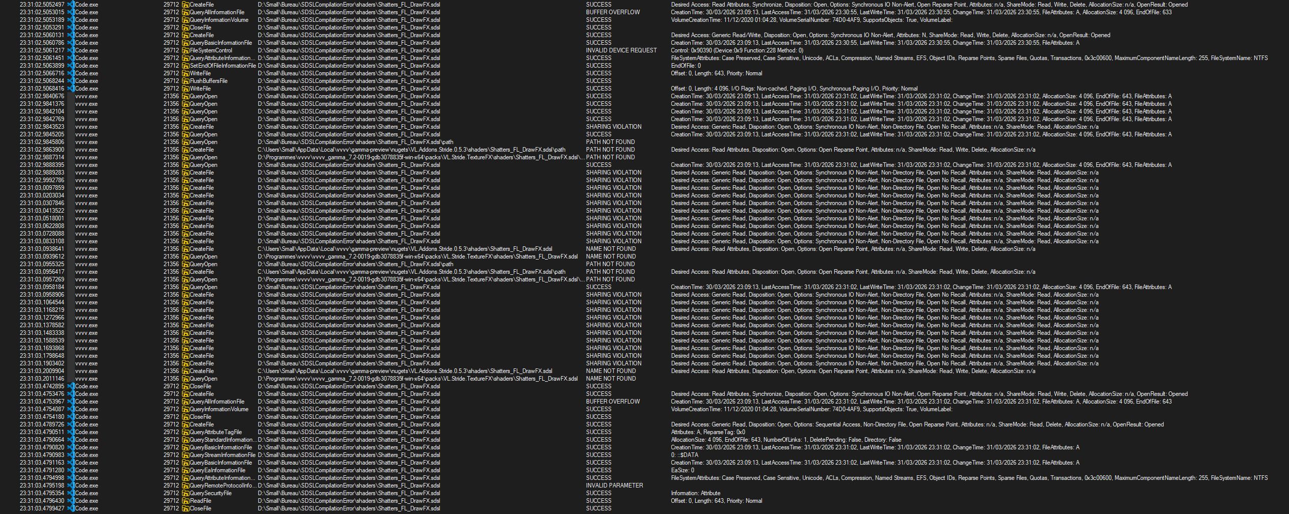 I’ve had .sdsl compilation errors since I’ve started using VVVV. When I save a shader I get an error on VVVV where it either tells me that it can’t find the shader anymore or that a dependency can’t be found, while it was able to find it just before.. always happened at random times, no visible pattern, never able to reproduce it by doing the same thing twice..