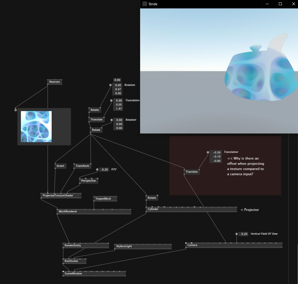 I noticed that there is a small offset when using the projected texture shader and then feeding the Position as view into a camera in stride. What it should do (and did in beta) is to have the projected texture look like 2D, but projected onto the 3D geometry correctly because both focal points match each other 100%.