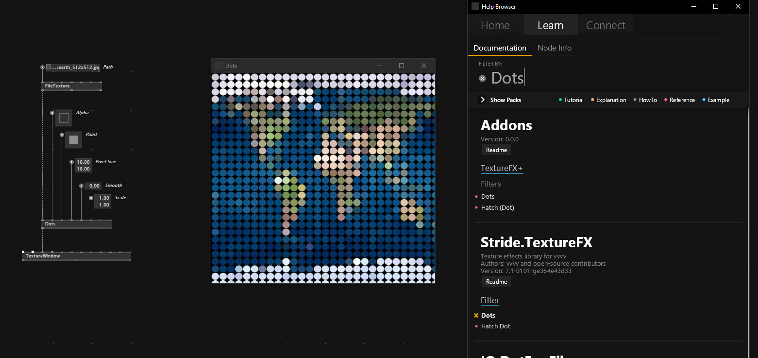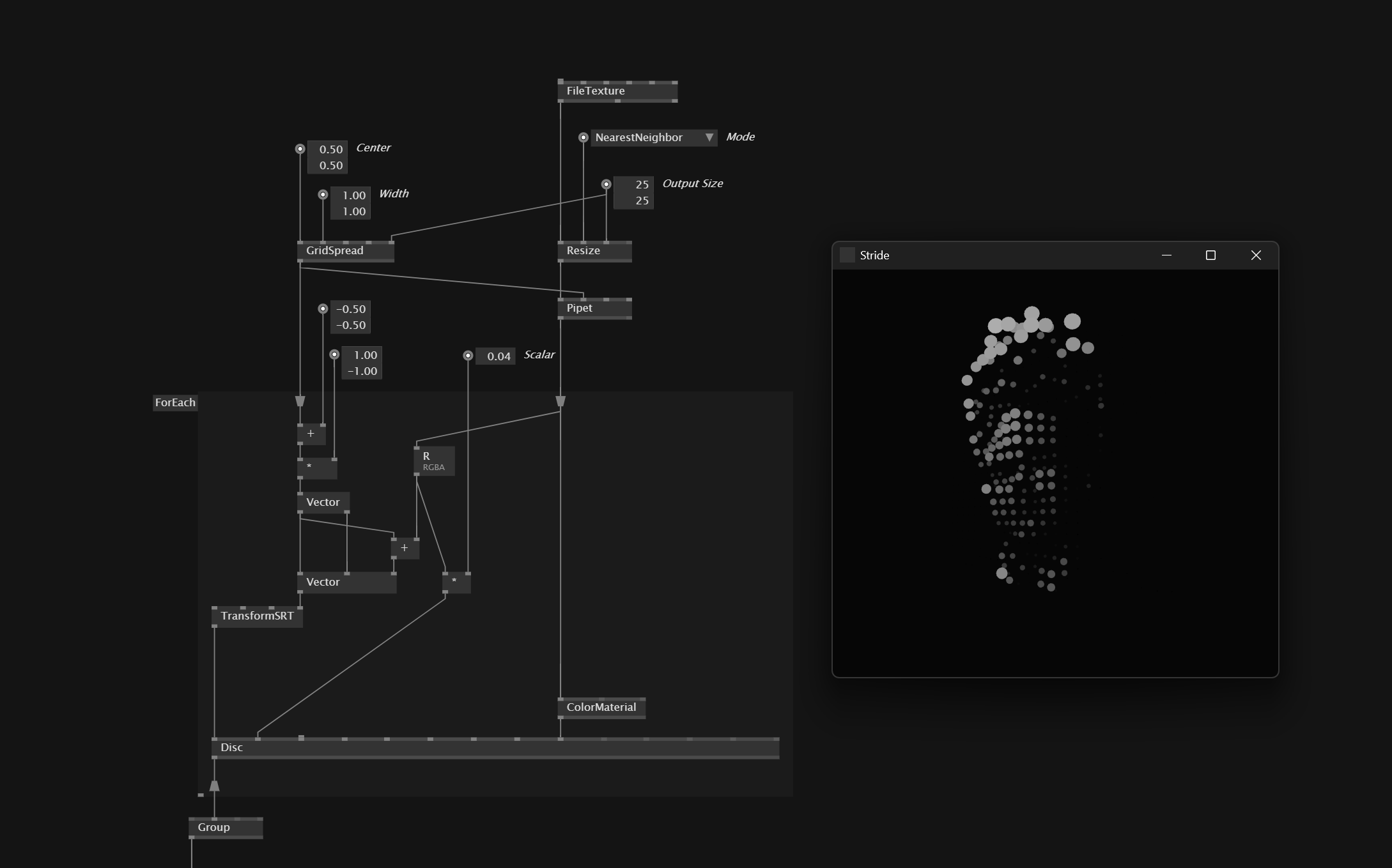 I created this example in TouchDesigner and want to replicate it in vvvv Gamma 7.x with Stride: map each pixel’s brightness to control circle size in a grid, with color inherited from the texture. Is there an help patch or example that shows this process?