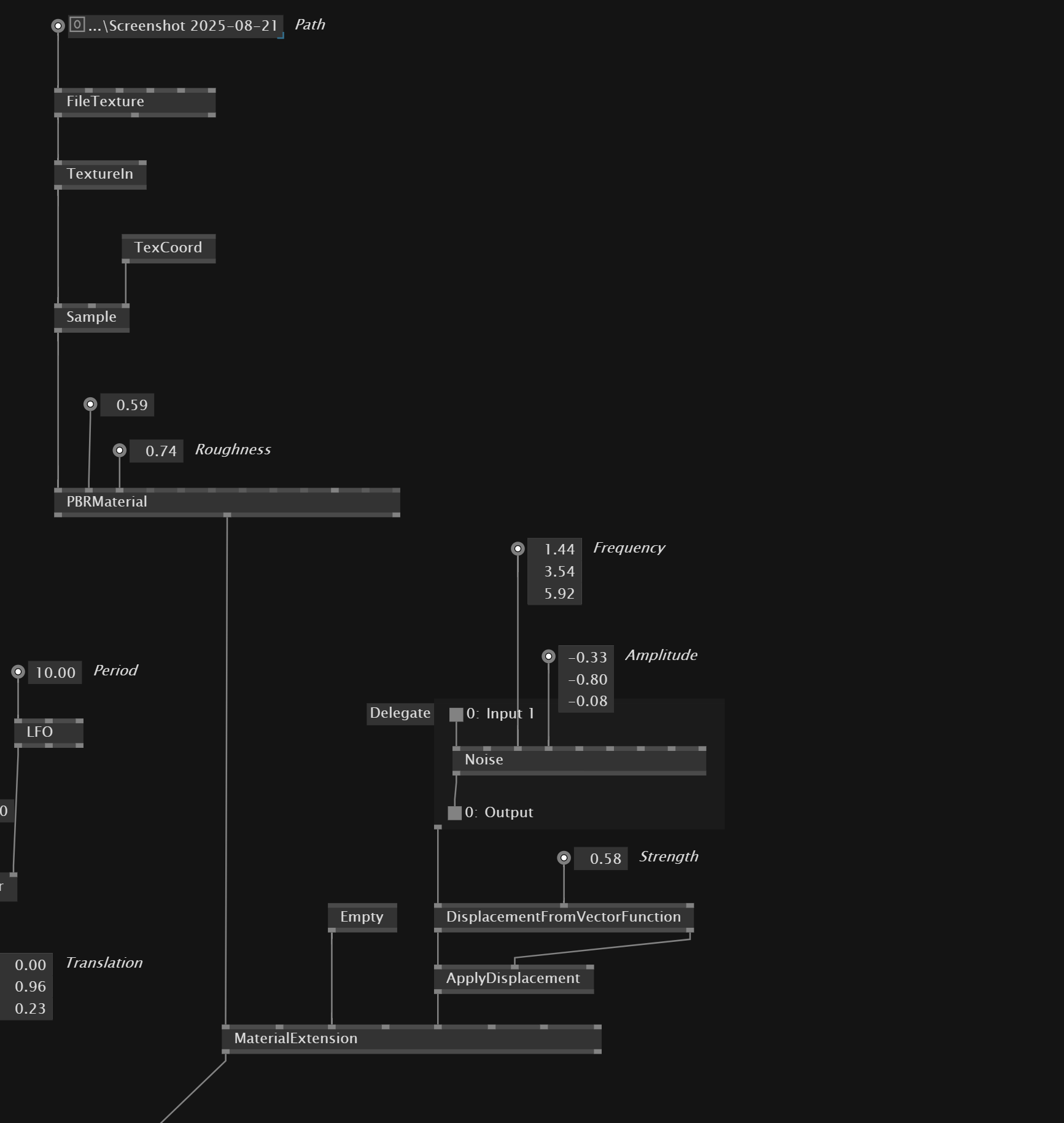 So I’m trying to use the texture from my filetexture to get it into the delegate to be able to use it for the DisplacementFromVectorFunction. I tried different ways to split the shadernode into just a float but all does’t really work.