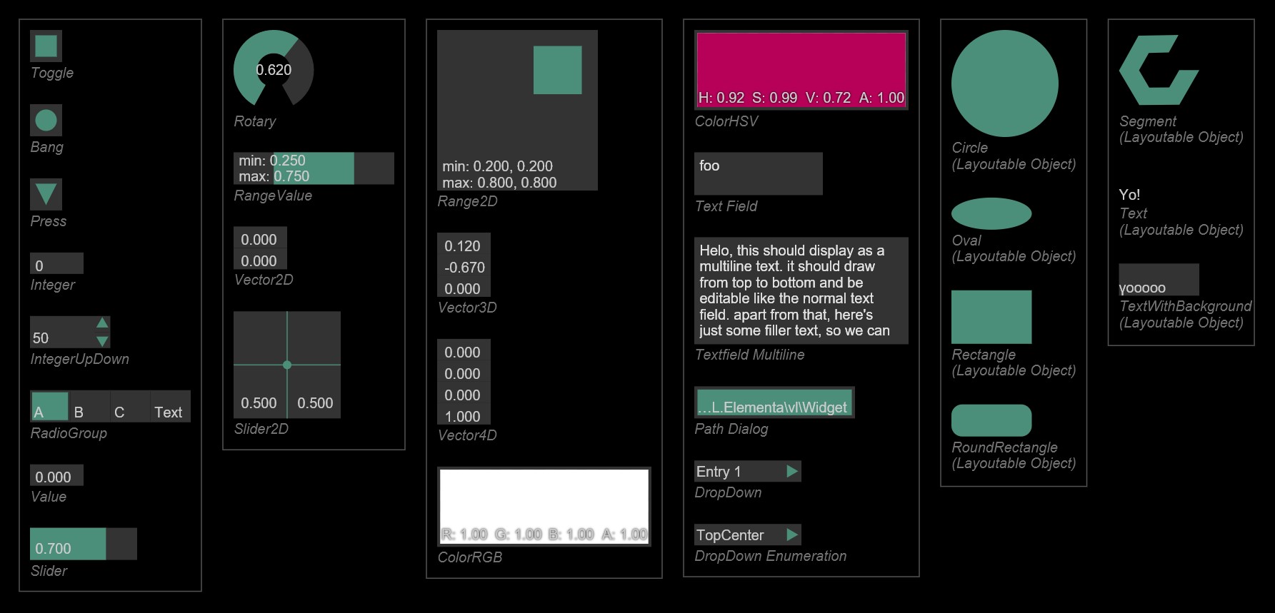 A nice color picker could be made by compounding the 2DSlider and a VSlider, with the right background it’ll be pretty much the somewhat ubiquitous Adobe CC style picker.