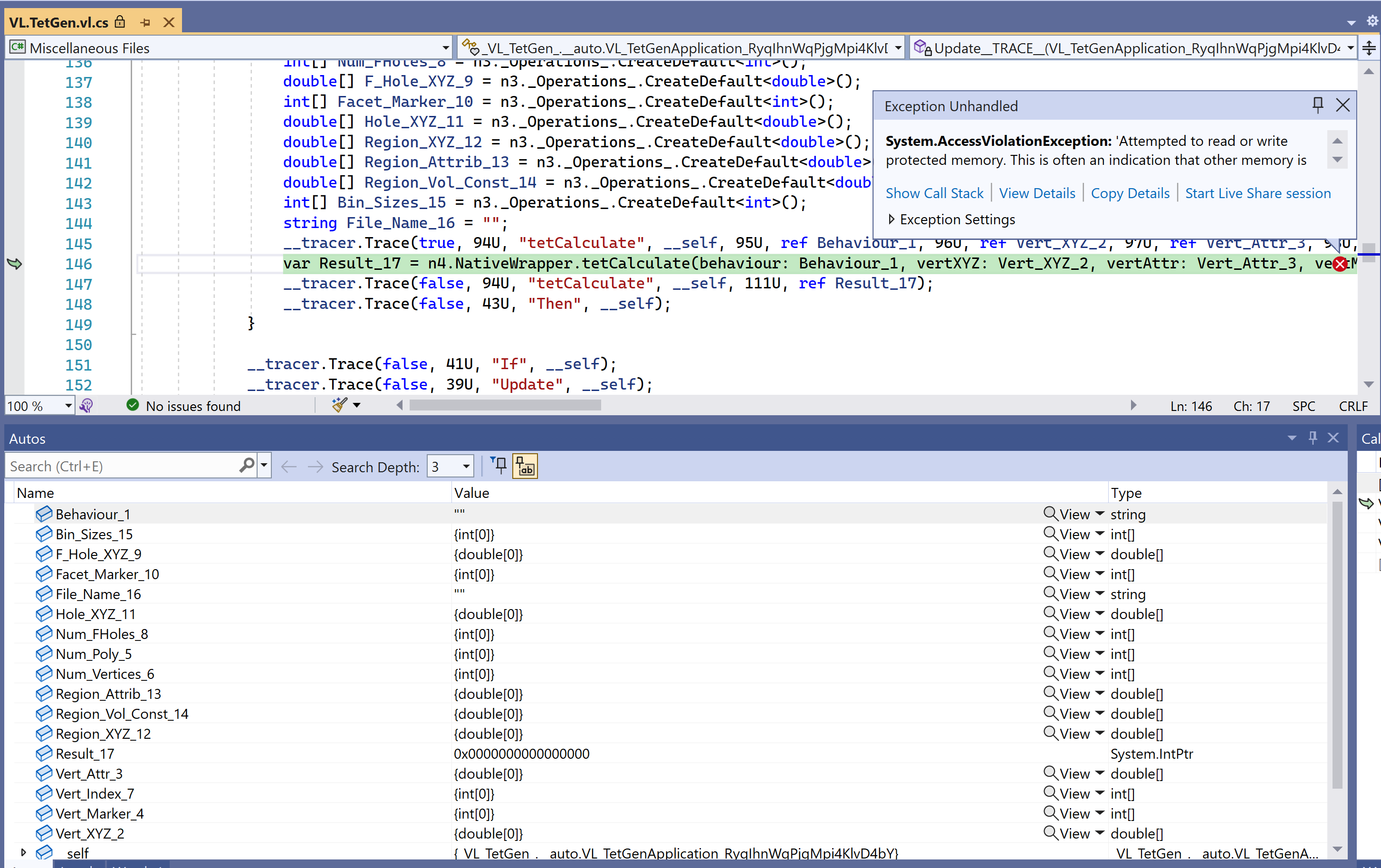 odd that you get to the error in the screenshot if you’re running exactly what i had in the PR, because this line should not be called at all. in your NativeWrapper.cs you have two classes “NativeWrapper” and “NativeAdapter”. in the state i pushed the VL.TetGen.vl file, it is calling the first one, your screenshot shows you’re calling the latter one. i am not sure what the latter one is really there for. if you don’t have a reason for it, i’d remove it.